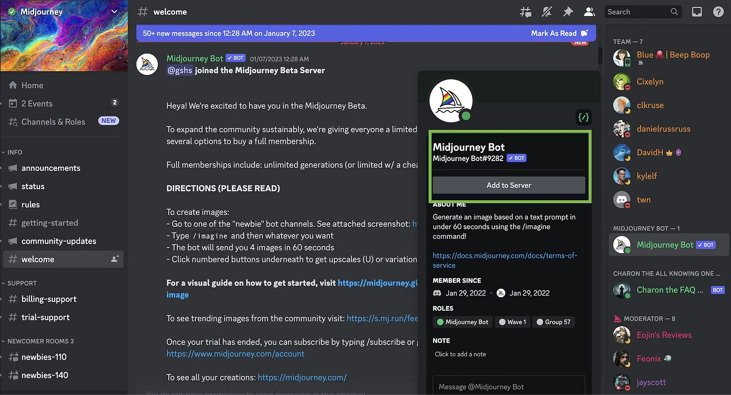 So they built a bot that generated images from text prompts. Type /imagine followed by a description, wait a few minutes, and you have AI-generated art.