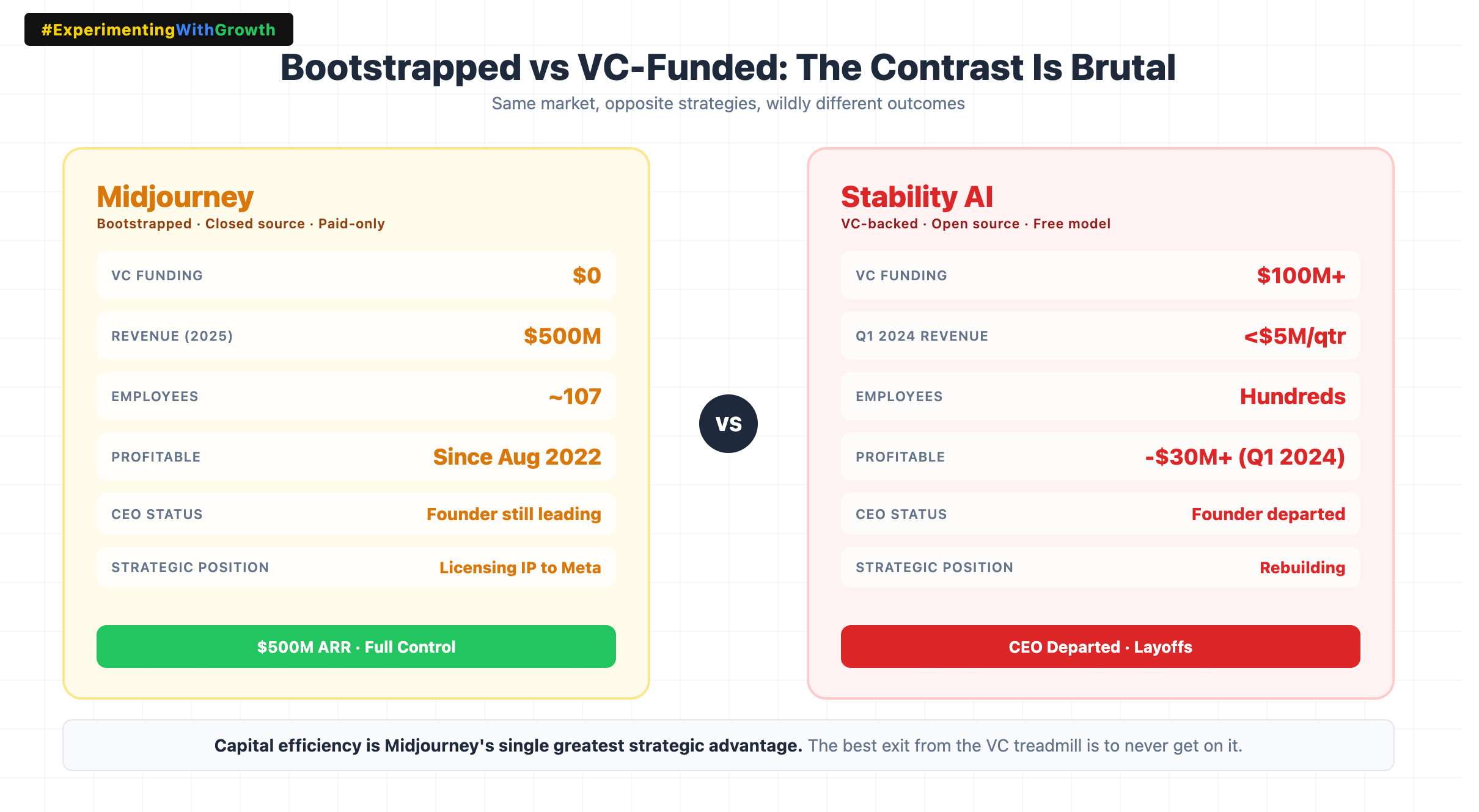 The contrast is brutal. Midjourney took zero outside money and built a $500M revenue machine with 107 people. Stability AI took $100M+ and nearly imploded.