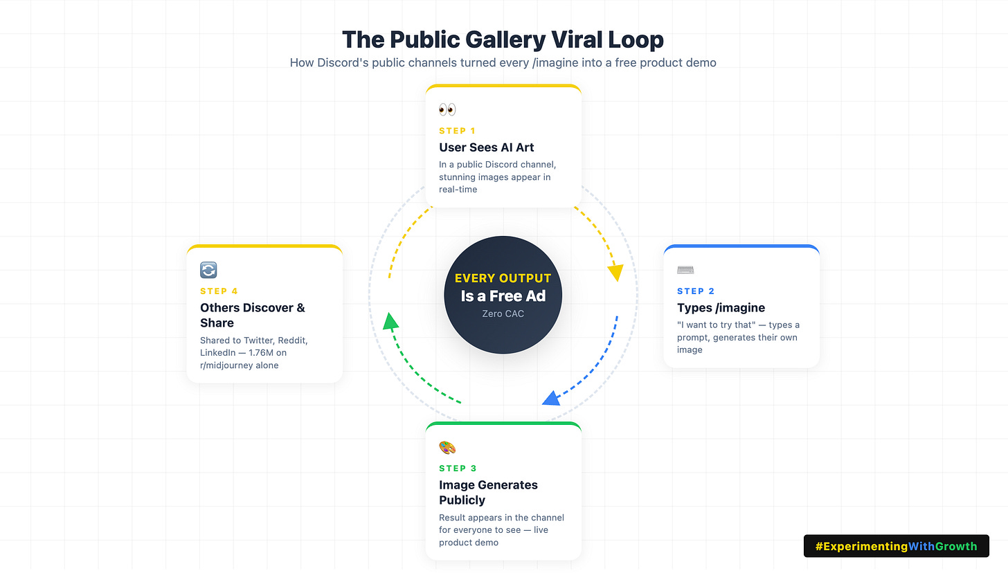 Every single image generation was simultaneously a product demo, an inspiration source, and a marketing asset. Midjourney turned Discord’s core feature (public chat) into a perpetual growth engine.