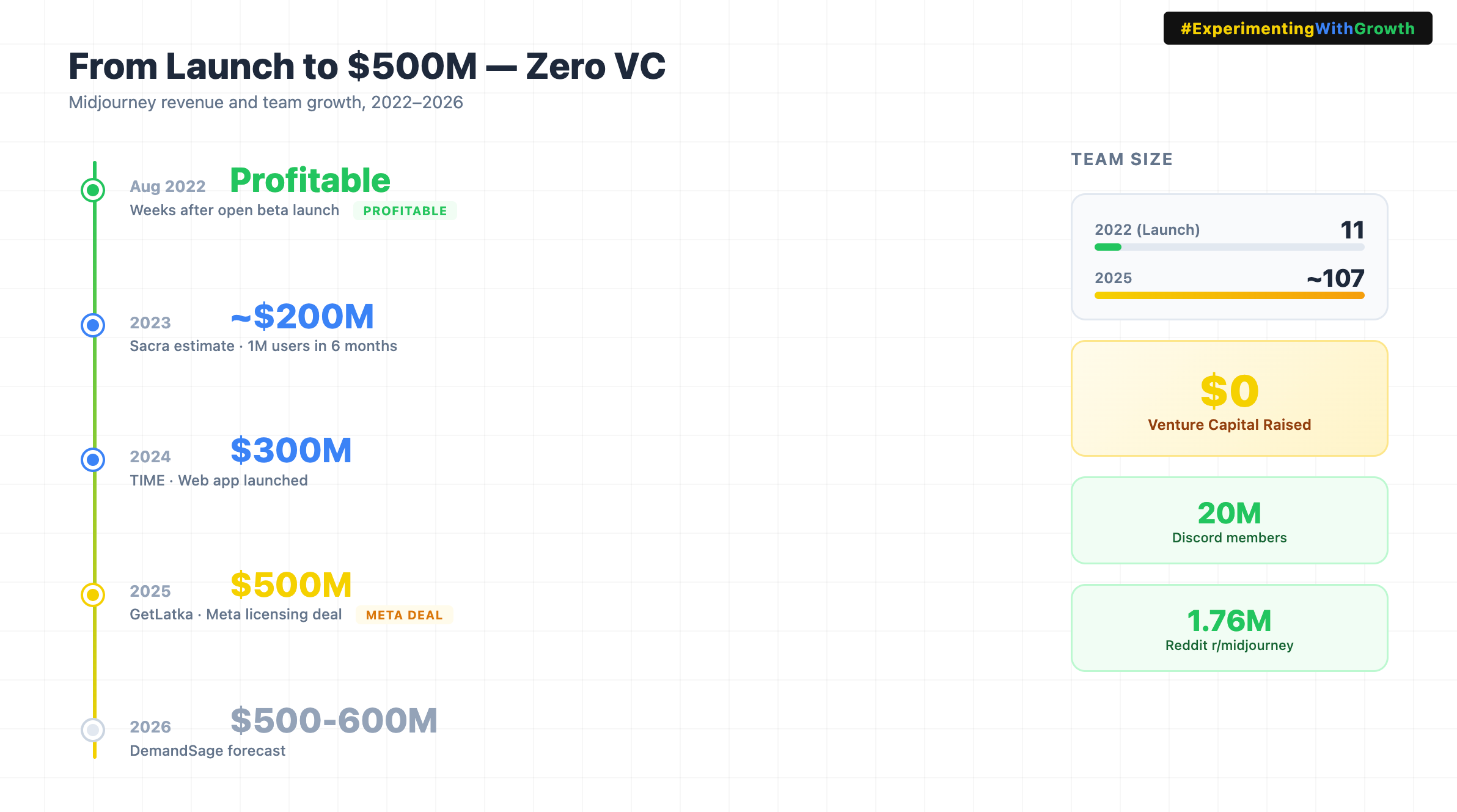 Strategic patience. When you’re profitable and growing, you can wait for the right deal. Midjourney didn’t need to sell to Meta or anyone else. They chose to license instead, keeping ownership of the company and the technology. A VC-backed company under pressure might have taken an acquisition offer at a fraction of the value.