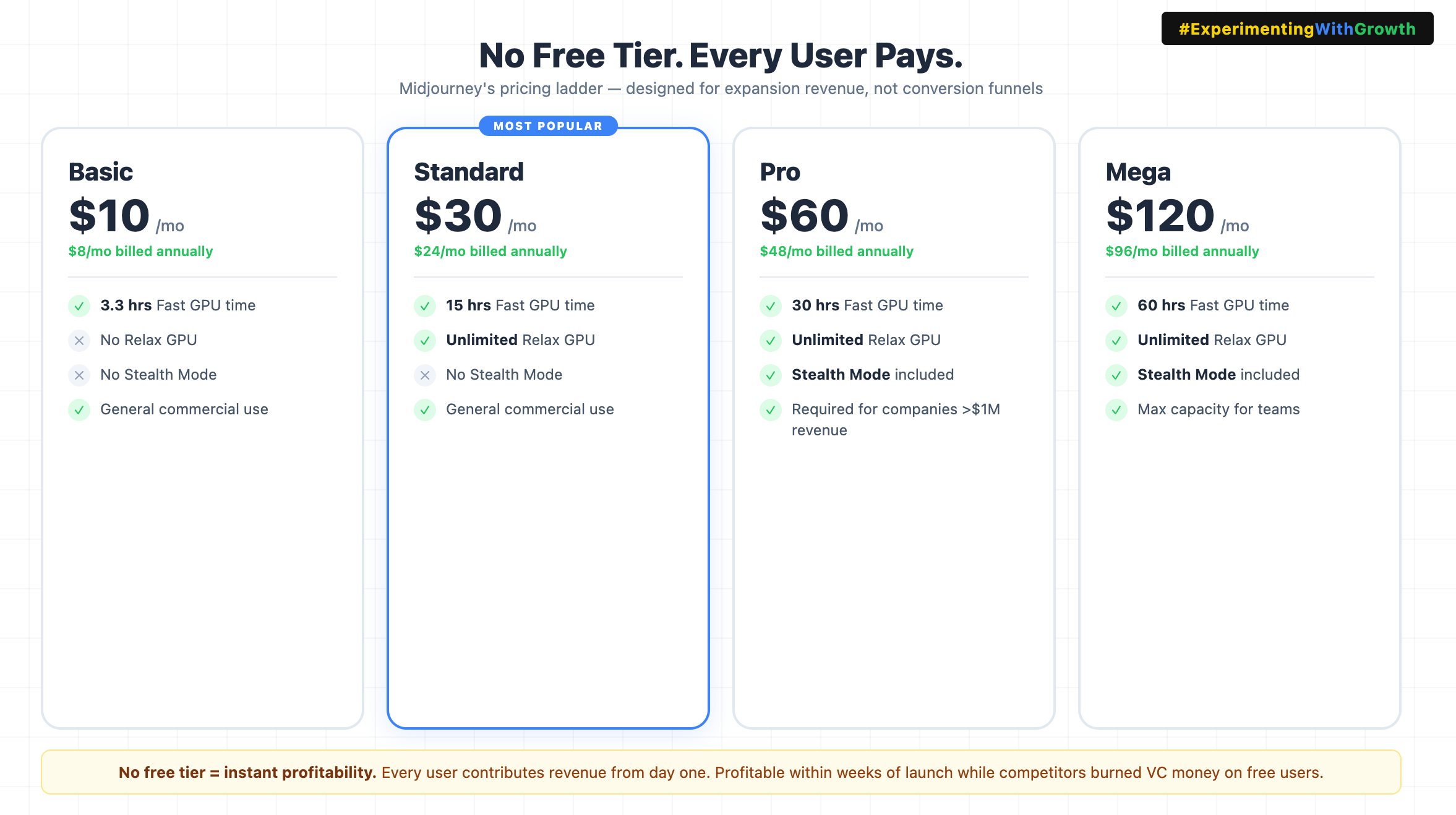 No free tier forces commitment. Every Midjourney user is a paying customer. That means profitability from month one, not year three.