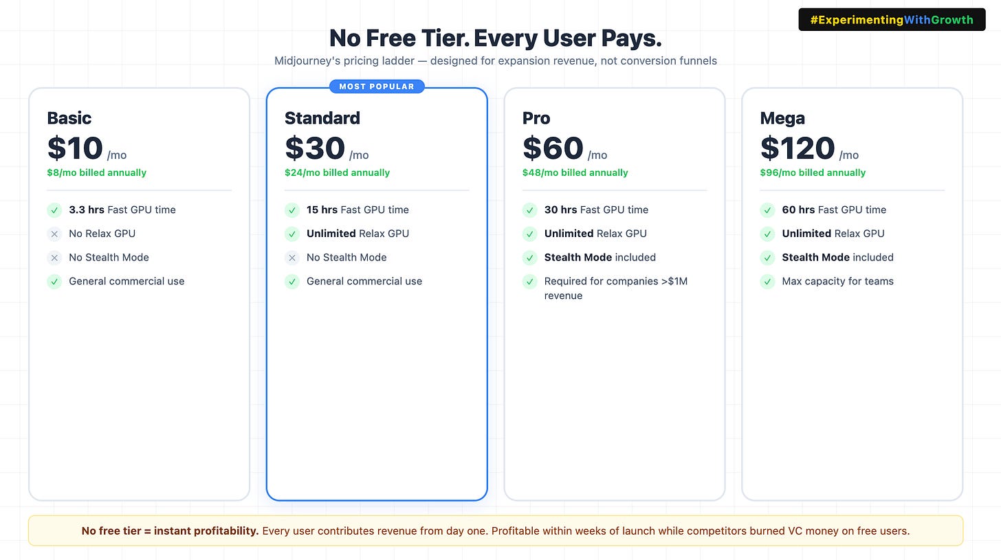 No free tier is a valid strategy. Every Midjourney user is a paying customer. That funded profitability from week one while competitors burned VC money on free users.