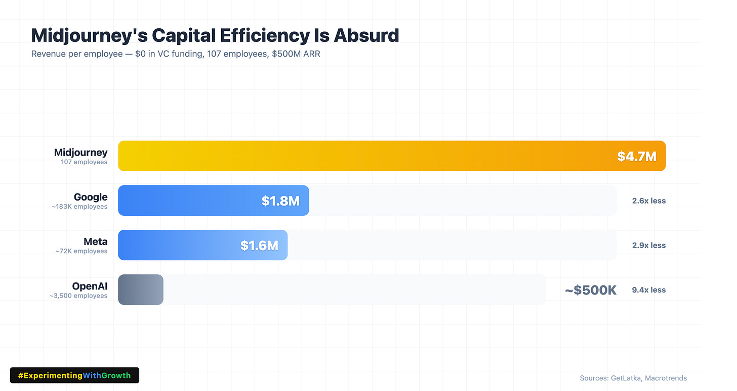 Midjourney generates roughly $4.7 million in revenue per employee — compared to Google’s $1.8M, Meta’s $1.6M, and OpenAI’s ~$500K. With only 107 employees and $500M in annual revenue, it’s one of the most capital-efficient companies in tech.