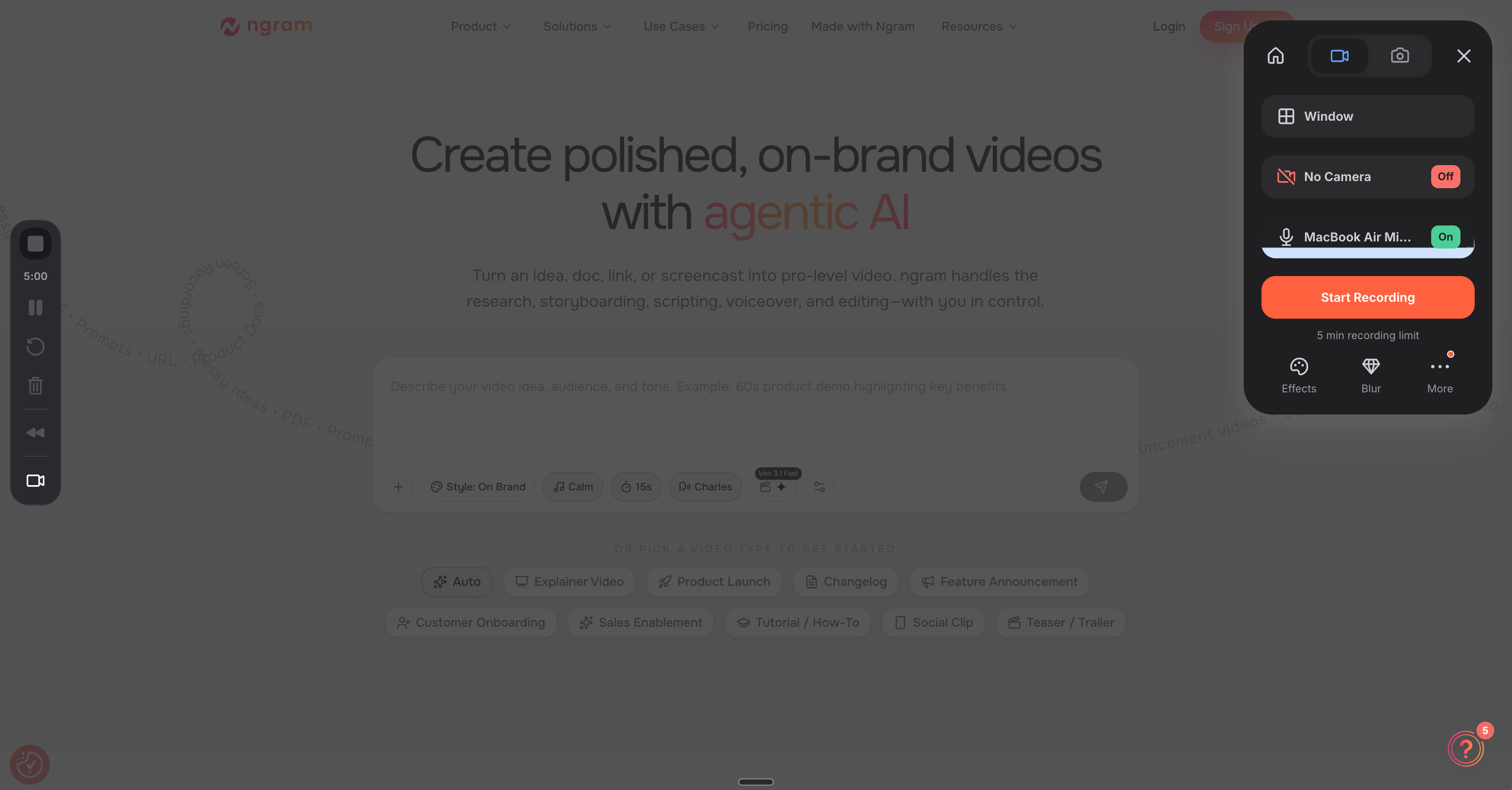 One button in your browser. Click it. Record your screen, your face, or both. Done. You get an instant shareable link. No app download. No login wall for viewers. No file to upload.