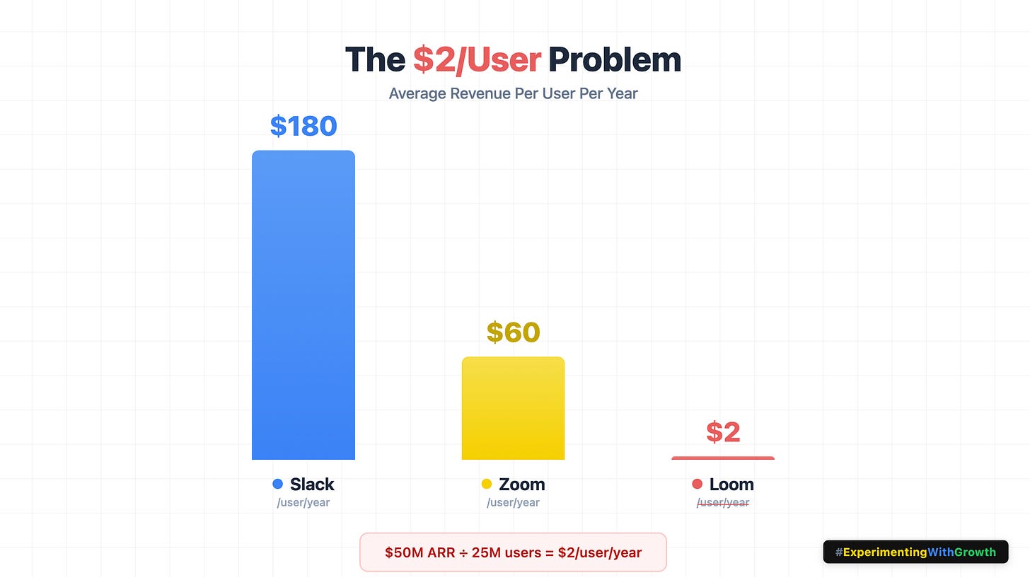 To be clear: Loom never charged $2/year. Their paid plans started at $10/month per user. The $2 figure is pure division: total revenue divided by total users. It means the vast majority of those 25M users were on the free tier and never converted.