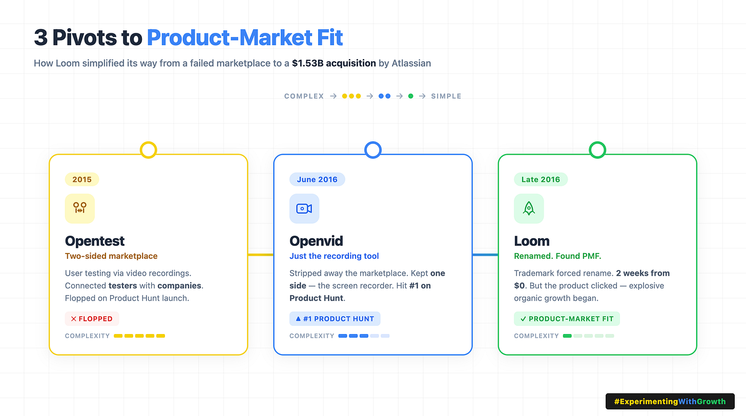 There’s a lesson here that’s easy to miss. Most startups pivot toward something bigger, something more ambitious. Loom pivoted toward something smaller. A two-sided marketplace became a one-sided tool. A user testing platform became a screen recorder. Each iteration had fewer features and fewer assumptions about user behavior.