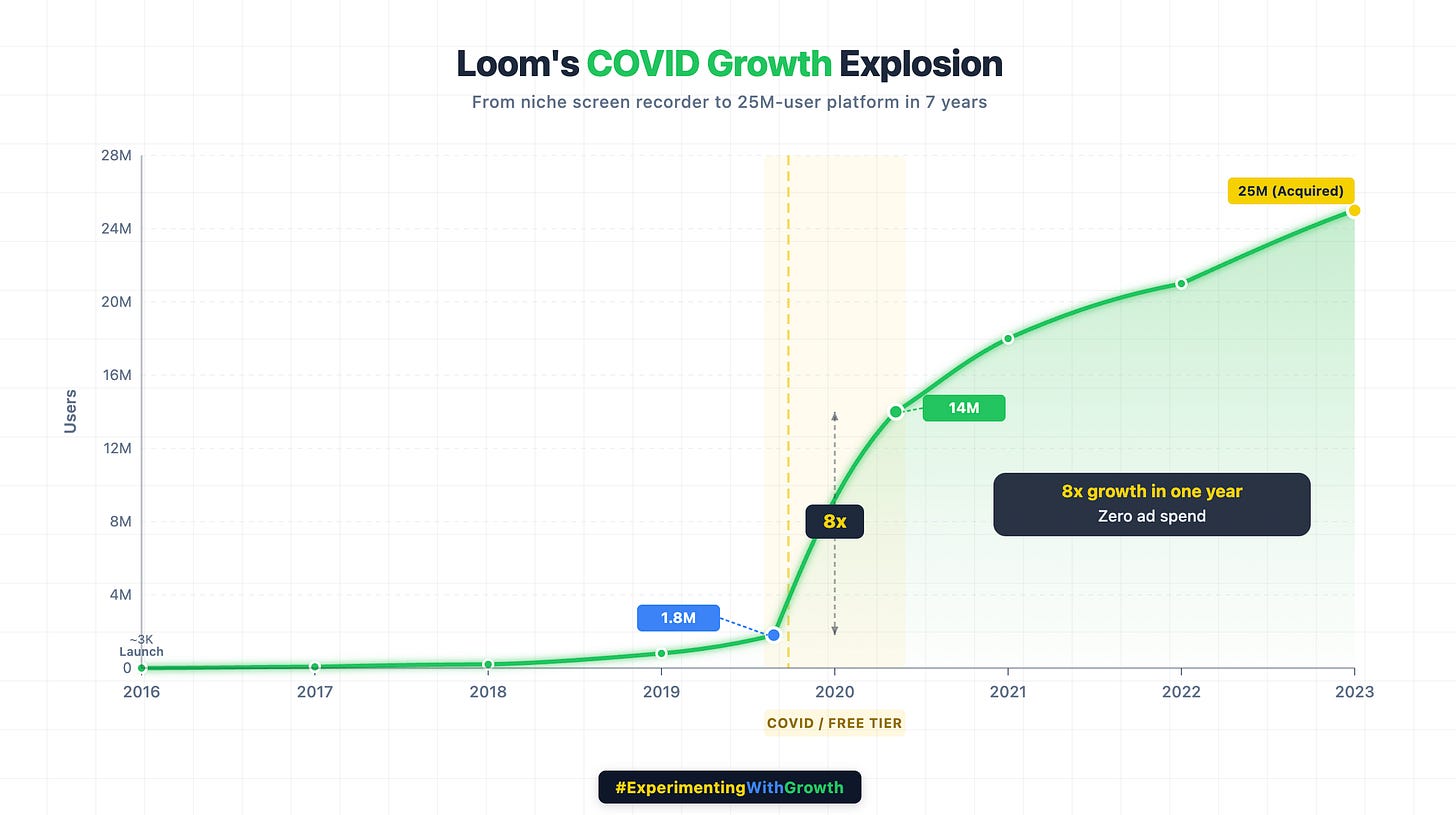 Strategically, it was brilliant. COVID forced a permanent behavior change. Millions of people learned to communicate asynchronously via video. Loom created the habit during the moment of maximum receptivity.