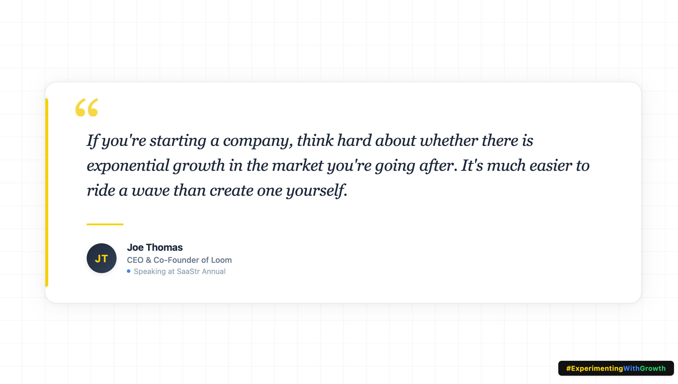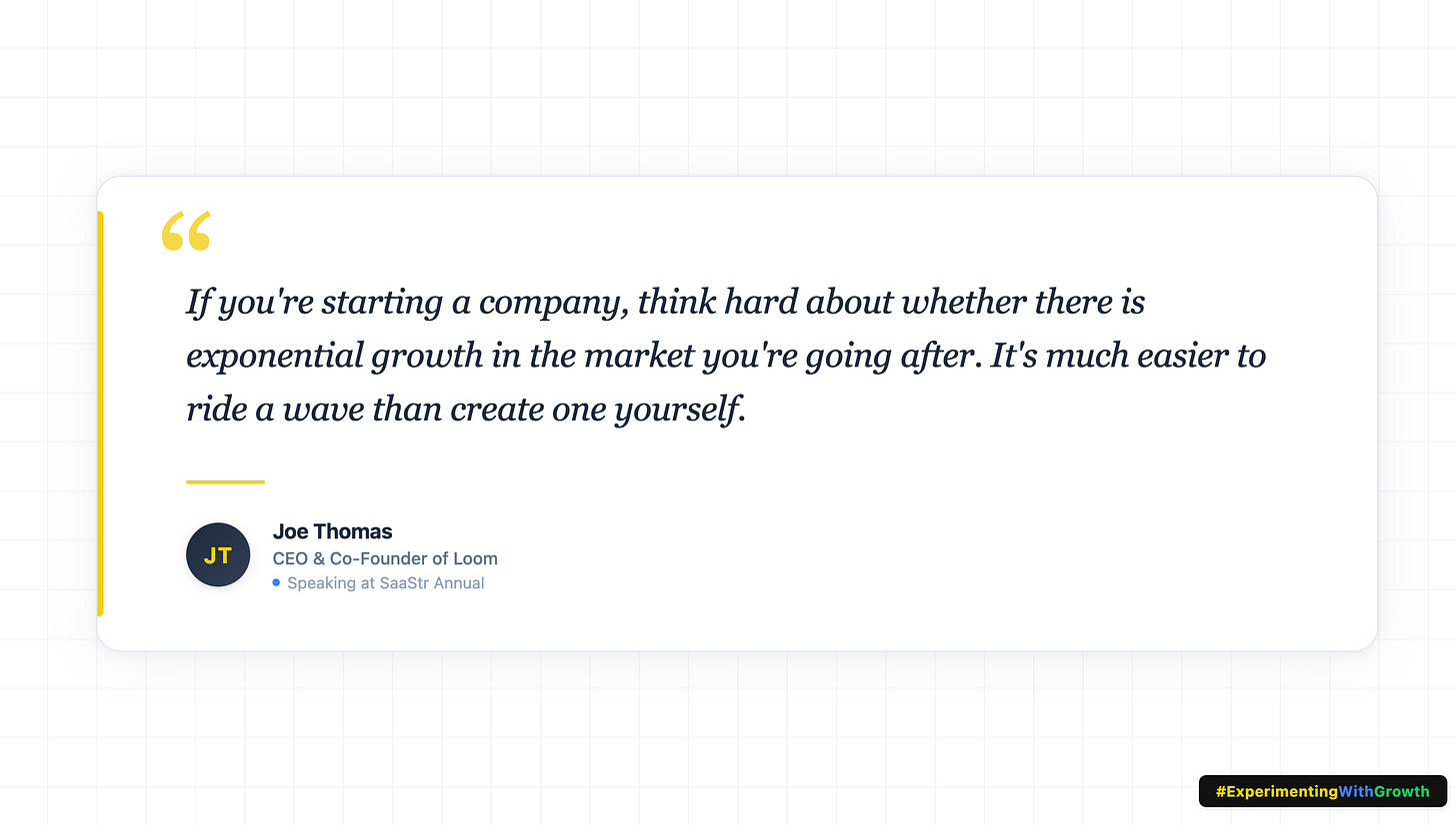 Joe Thomas put it well at SaaStr: “If you’re starting a company, think hard about whether there is exponential growth in the market you’re going after. It’s much easier to ride a wave than create one yourself.”