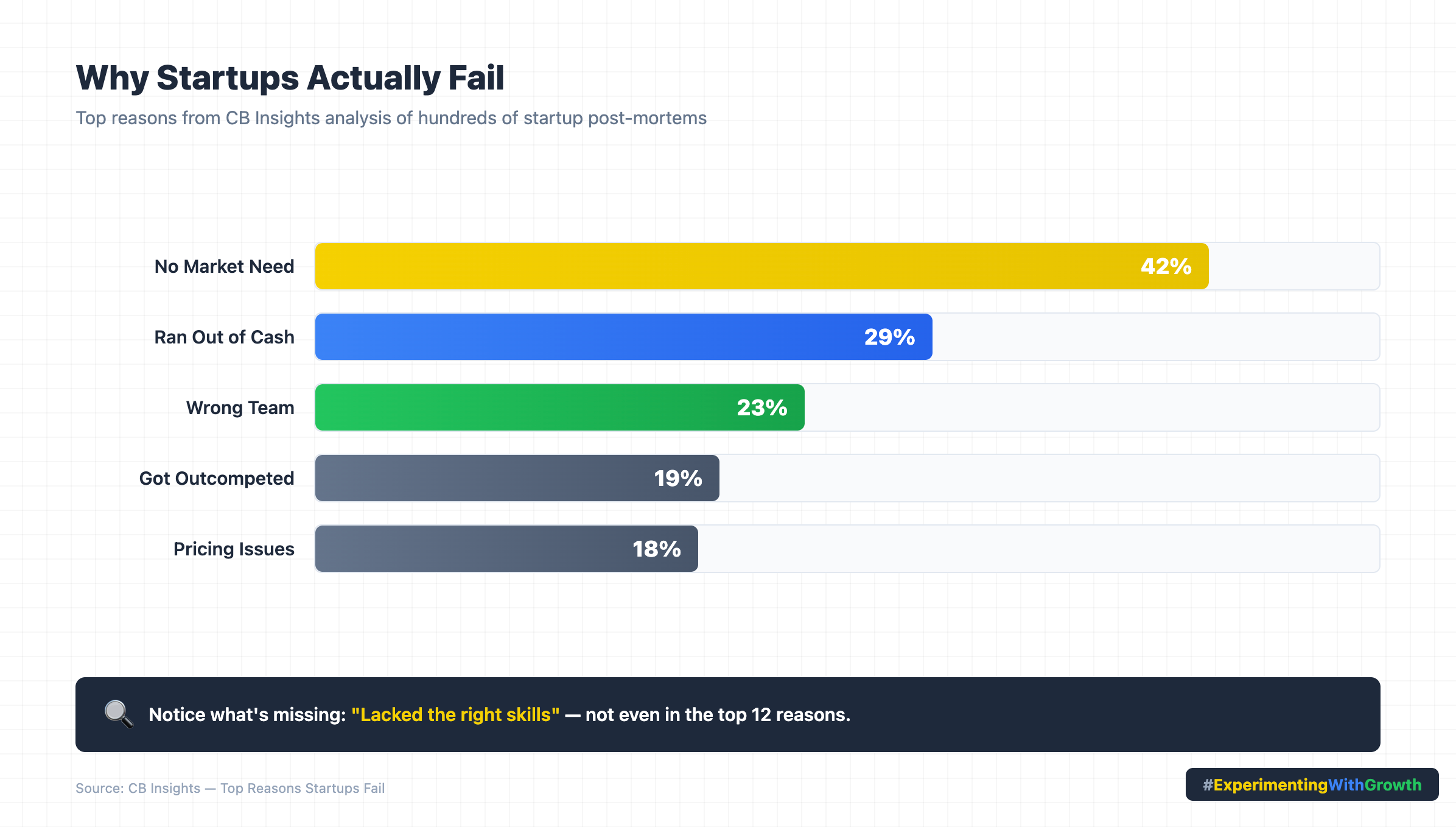 CB Insights analyzed hundreds of startup post-mortems and found the top reasons are no market need (42%), running out of cash (29%), wrong team (23%), getting outcompeted (19%), and pricing issues (18%). Notably, “lacking the right skills” does not appear in the top 12 reasons — every top failure traces back to mindset, not knowledge gaps.