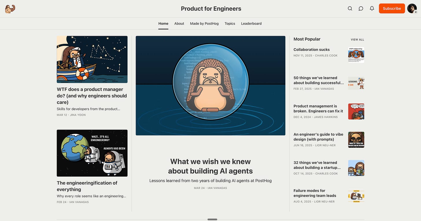 His personal newsletter reads like a founder who genuinely enjoys thinking about product and growth rather than someone doing content marketing. Posts like “How not to be boring” and “Collaboration sucks” take contrarian stances and back them with PostHog’s own experience.