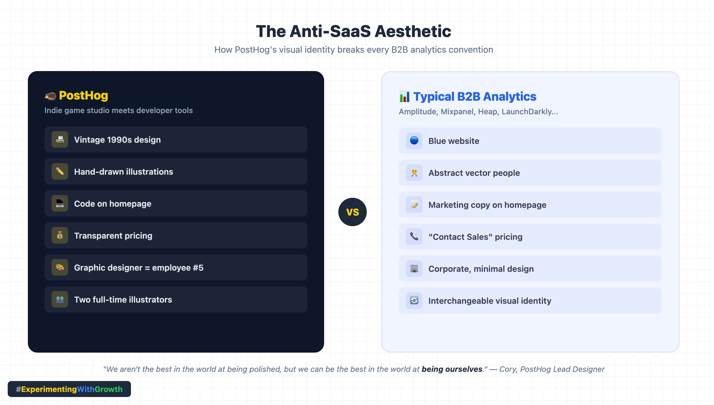 What you can steal: Your brand’s visual identity is a bet. You can bet on fitting in (safe, forgettable) or standing out (risky, memorable). PostHog bet on standing out. Figma made a similar bet with design-led differentiation. The trick is making it intentional, not random. Hiring a graphic designer as employee #5 signals that brand isn’t an afterthought. It’s infrastructure.