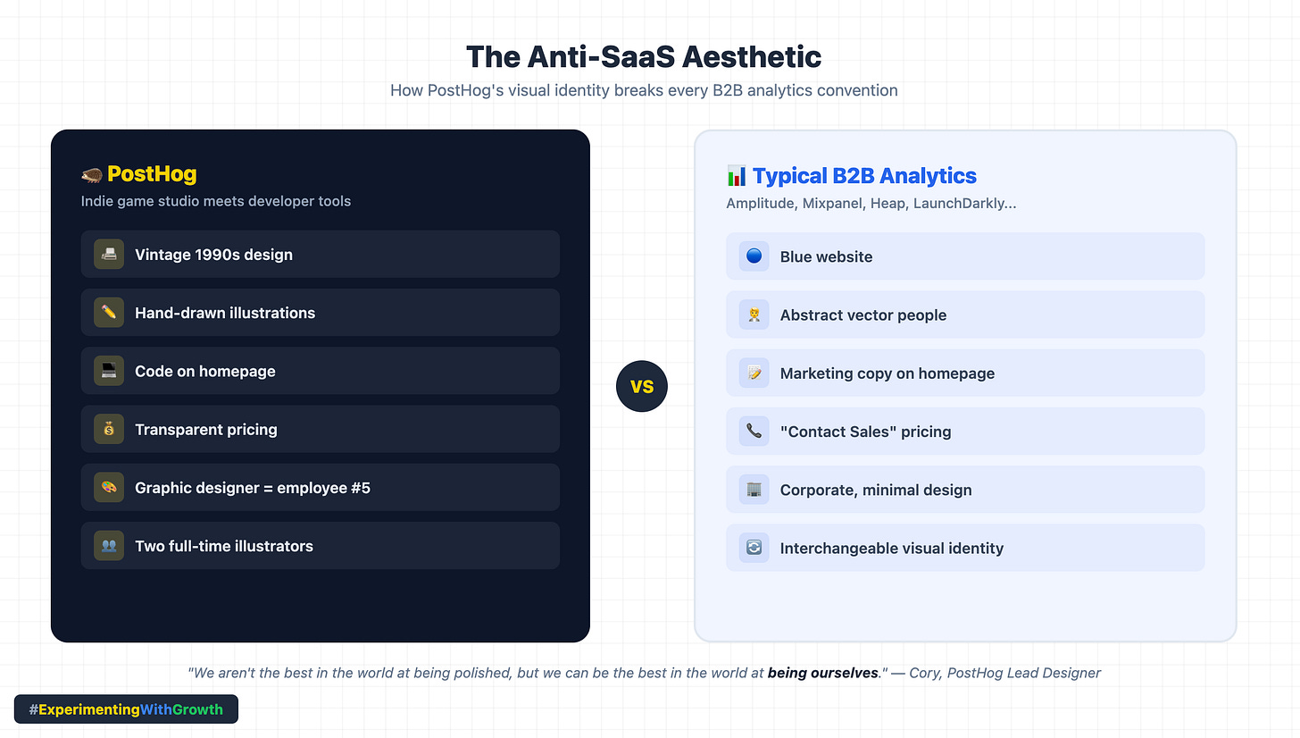 This matters for the brand because the people PostHog hires become the brand. When your engineers are opinionated, your docs will be opinionated. When your designers are weird, your website will be weird. When your sales team is anti-corporate, your sales calls will feel different.