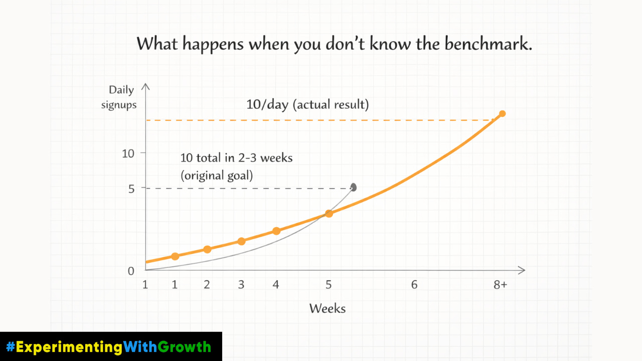Here’s what I deliberately didn’t do: research whether my target was achievable. Because if I had, I probably would’ve found some benchmark telling me to expect 2-3 signups per week in the early days. And I would have optimized for that instead.