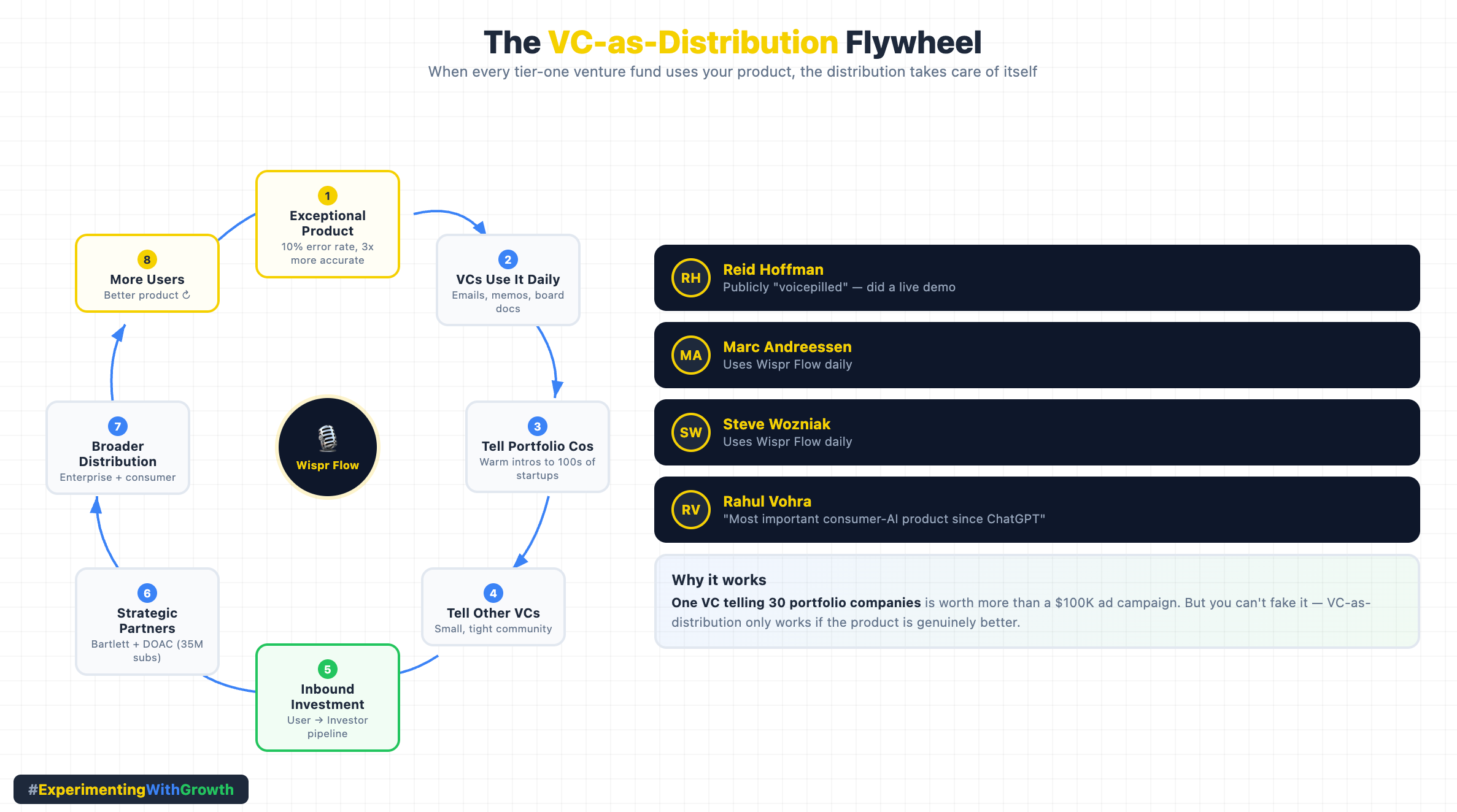 The early traction came from an unexpected demographic: Silicon Valley VCs. Every tier-one venture fund in the valley started using Flow for their emails, memos, and documents. This would become the single most important distribution channel for Wispr’s next phase.