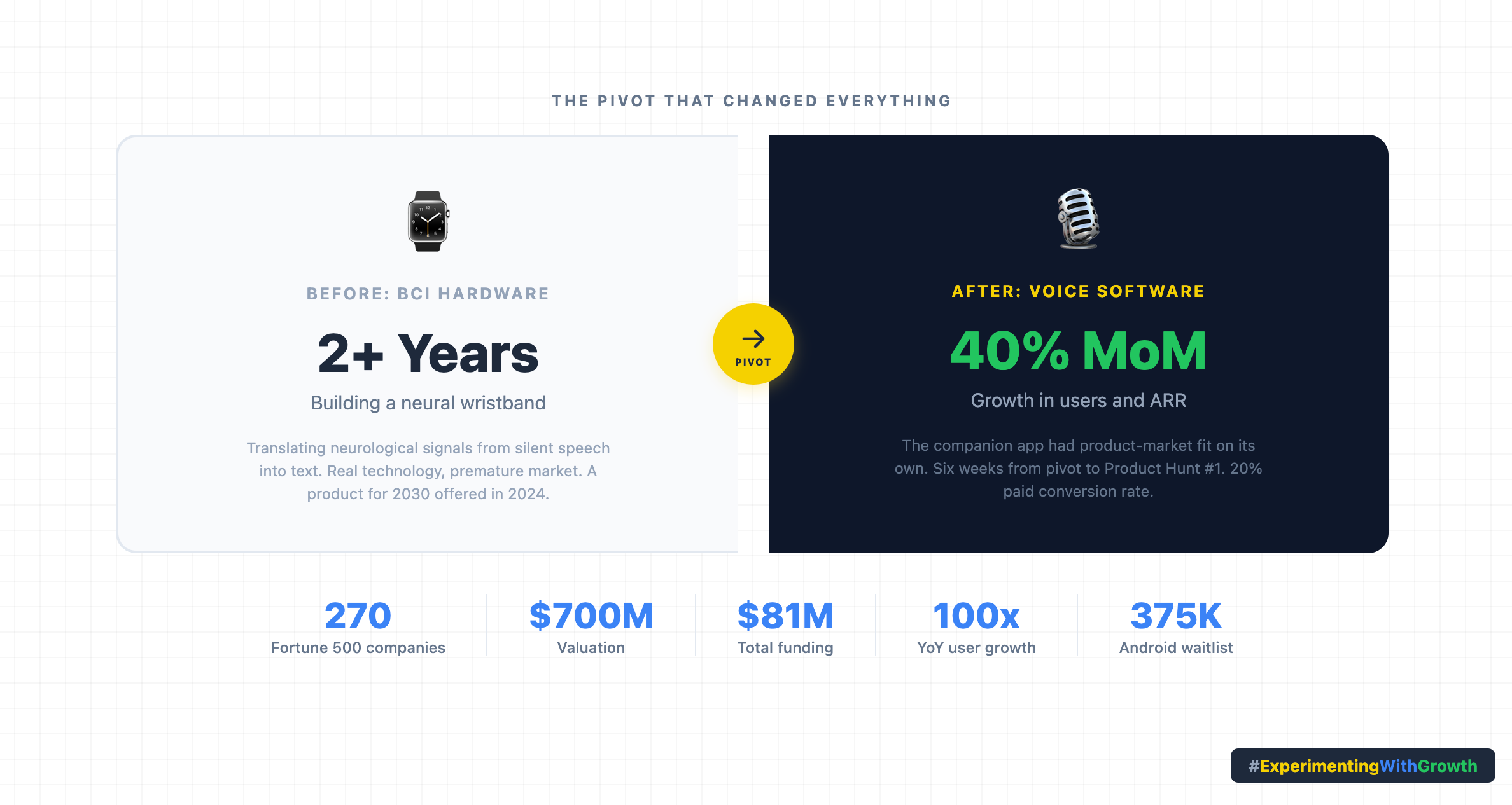 The neural wristband wasn’t a bad idea. It was a premature idea. The software layer they built to test it, however, had immediate product-market fit. Recognizing which layer of your stack IS the product is one of the hardest strategic calls a founder can make.