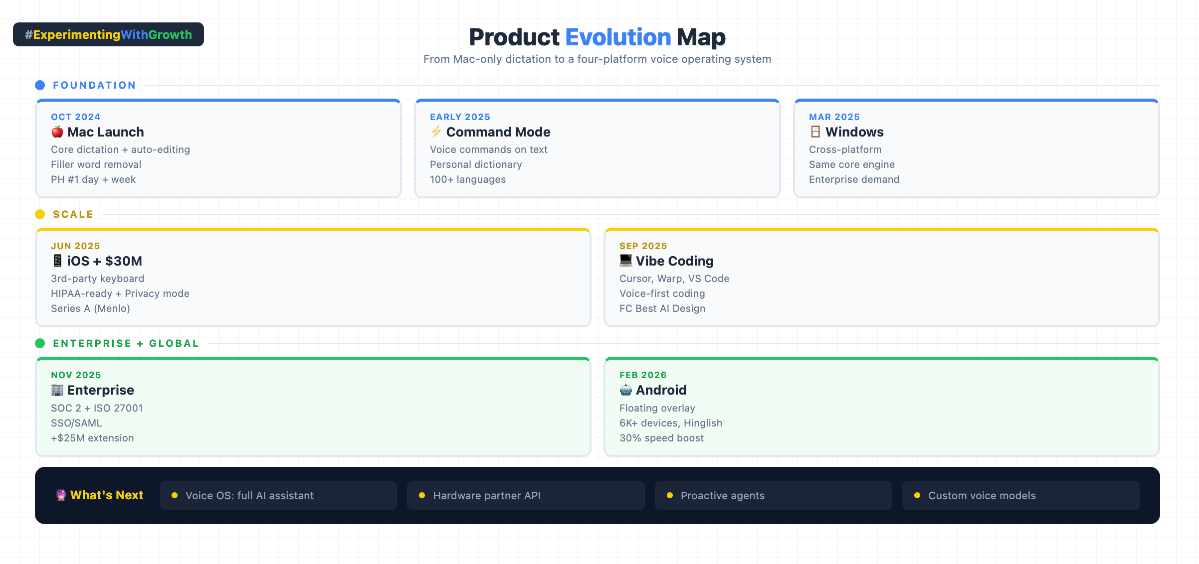 Wispr’s product roadmap tells a story of disciplined expansion: nail one platform, prove the habit, then expand.