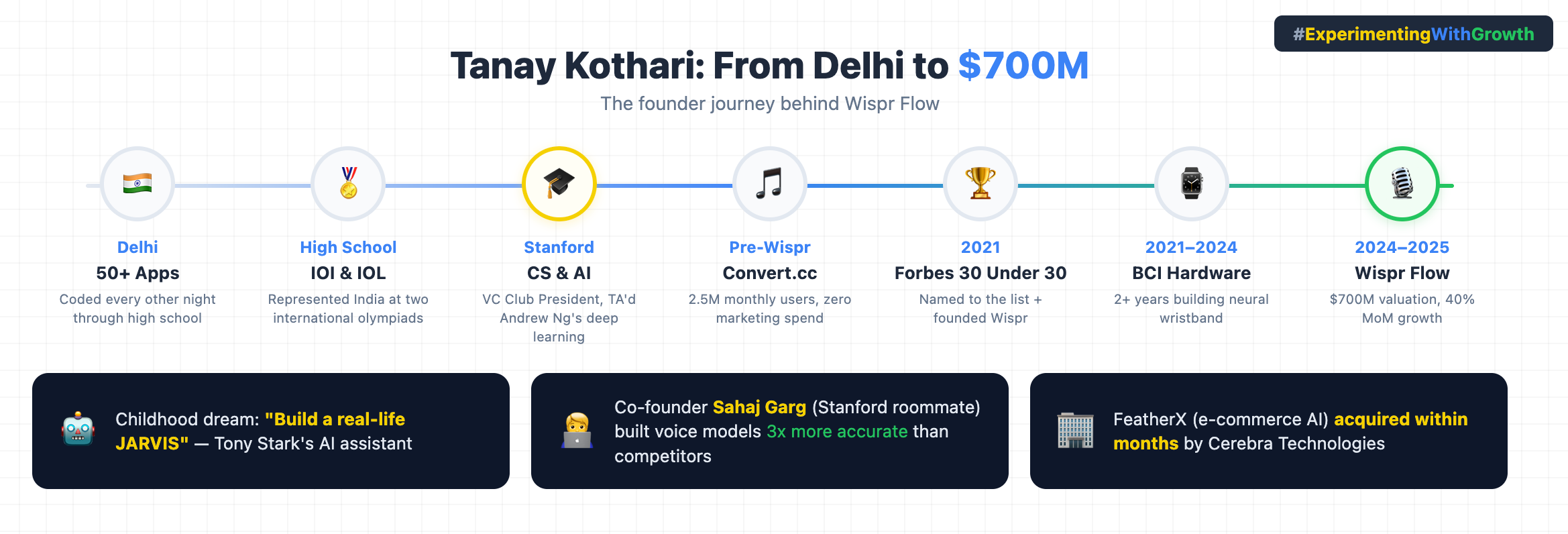 Before Wispr, Kothari built Convert.cc, a music intelligence platform that hit 2.5 million monthly users with zero marketing. He spent time at Microsoft leading a personalization project for Microsoft News. Then founded FeatherX, an e-commerce personalization platform that was acquired within months by Cerebra Technologies.