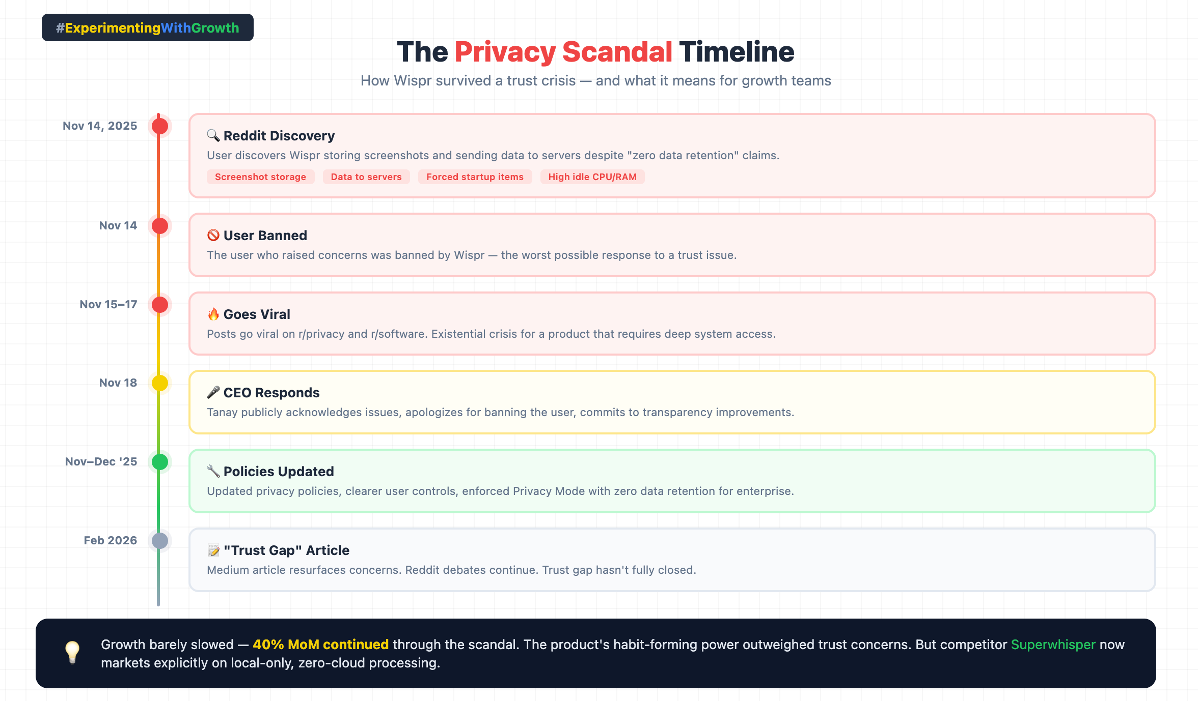 The lesson for growth teams: when your product requires deep system access, transparency isn’t a nice-to-have. It’s oxygen. Wispr’s growth barely slowed (40% MoM continued through the scandal), which suggests the product’s habit-forming power outweighed the trust concerns for most users. But the stain remains. And in a space where competitors like Superwhisper market explicitly on local-only, zero-cloud processing, the privacy angle is a permanent competitive vulnerability.